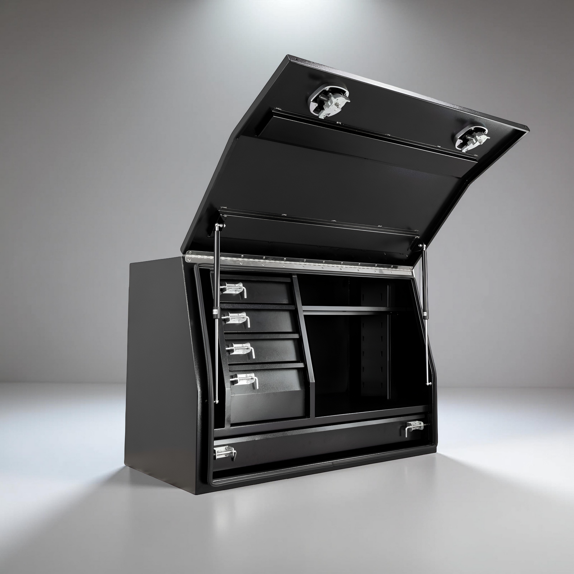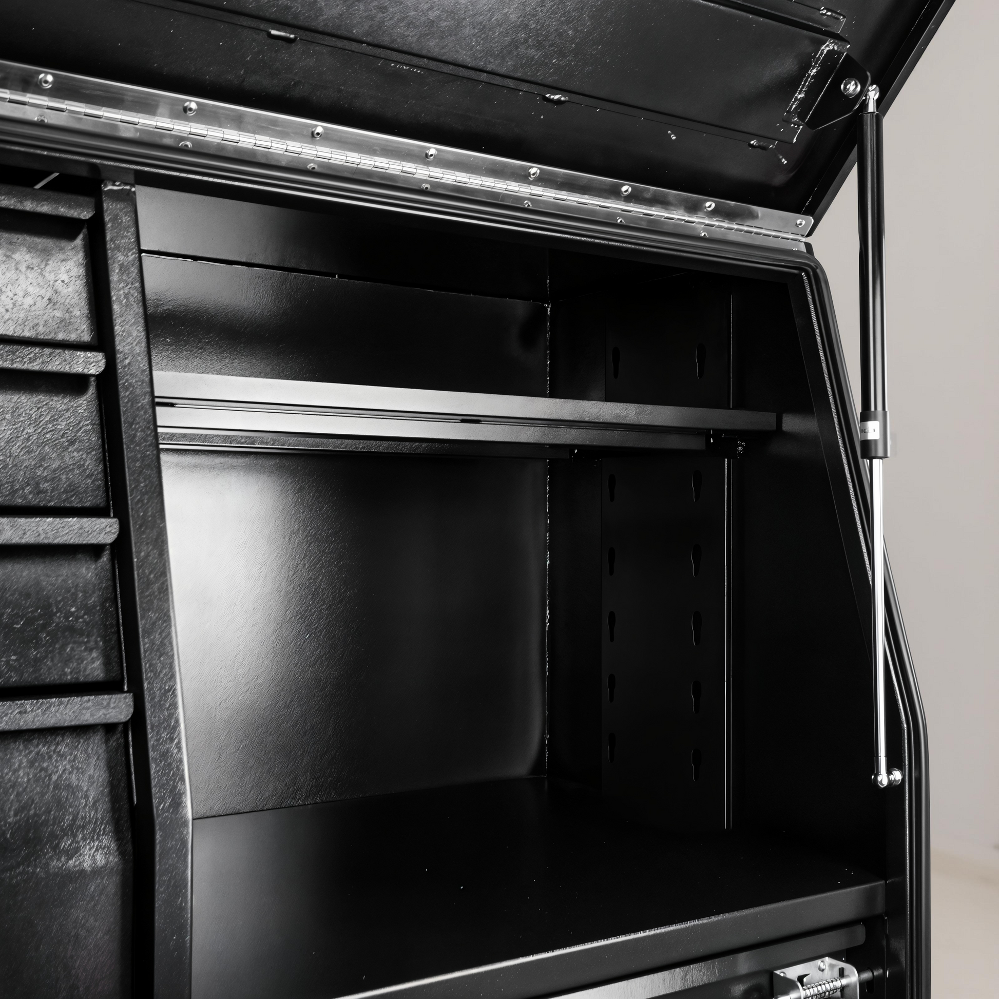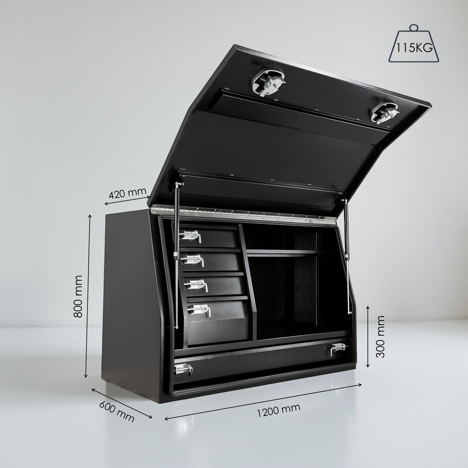 When you’re hauling gear across the jobsite or out bush, the Boximus 1200mm Black Steel 5 Drawer Toolbox delivers strength that never quits. Built from heavy-duty powder-coated steel, it’s made to handle rough workdays, hard knocks, and the harsh Aussie climate. Five drawers keep everything from drill bits to power tools sorted, while the top shelf compartment gives you extra space for the bulky stuff. With smart features like whale tail compression locks, twin gas struts, and weather-sealed protection, this unit proves why Boximus gear is trusted by serious tradies who demand reliability over gimmicks.
